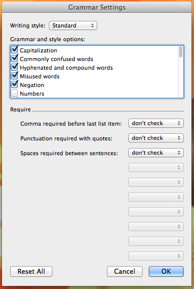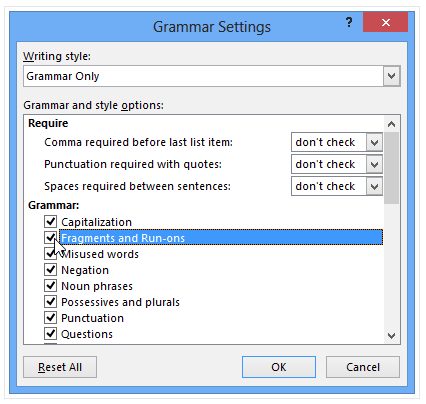 I’m using Word 2013 for PC. 2007 and earlier may look more like the Mac version above than this PC version. In your menu bar, go to File, Options, and choose Proofing. Click the Settings button next to Writing Style. A dialogue box that looks like this will open: