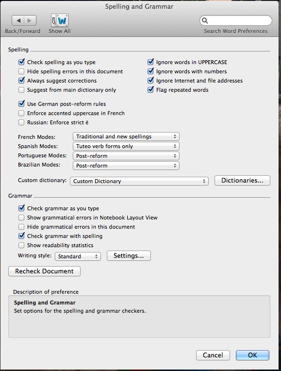 Back to Spelling and Grammar Preferences (first dialogue box, above). Move your mouse over the first set of checkboxes (Spelling on Mac). In Mac, as you hover over each preference, you’ll see its description in the box at the bottom. [There is no description box for PC.] For example, Check spelling as you type is checked by default, meaning that Word will automatically check your spelling, underlining misspelled words with red squiggles as you type them. If you don’t want to be distracted by red marks as you work, uncheck this box. When you finish working, reopen the dialogue box and click on Recheck Document near the bottom of the page, and Word will check the entire document for spelling and grammar errors.